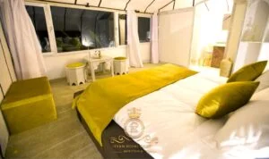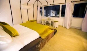 Bathed in sunshine, the Lalla Salma Suite dazzles with vibrant yellow décor enhancing the desert’s warmth. Nestled at Itran Royal Camp, this sunny luxury tent combines bright elegance and comfortable design amid sands of Erg Chebbi.