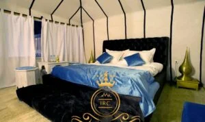Step inside this royal tent and breathe in tranquility with calming blue accents, luxurious linens, and refined design. With ensuite bathroom and discreet lighting, it reflects desert elegance and sophistication. Arabesque touches complement sweeping views across dunes at sunrise or sunset, making each moment deeply memorable.